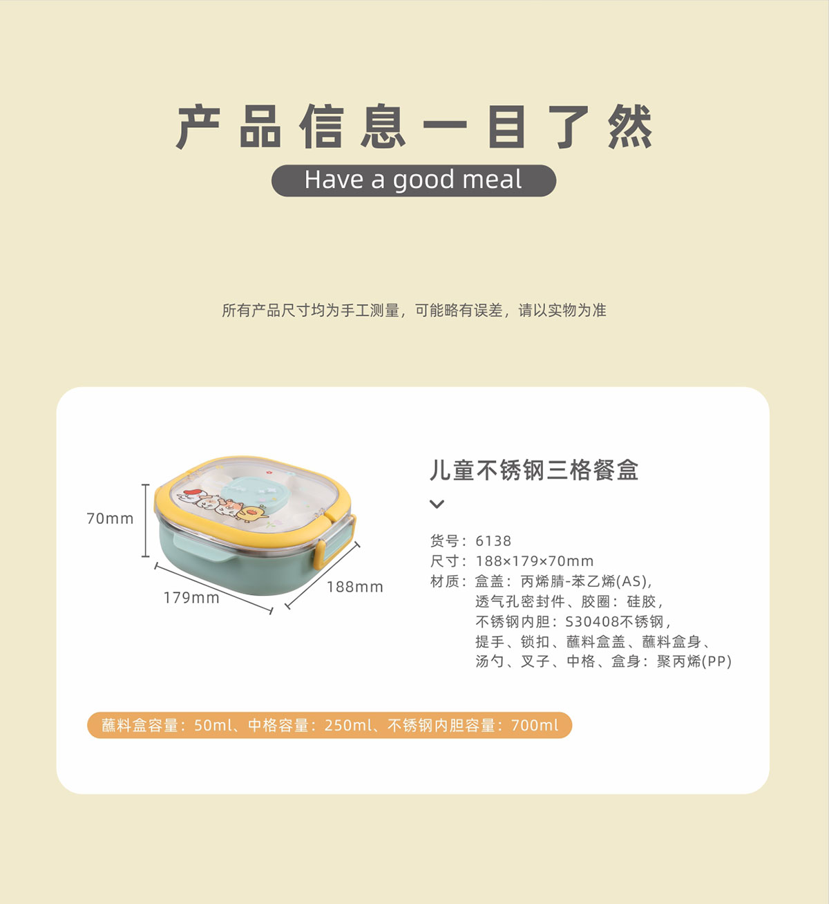 兒童不銹鋼三格餐盒(內(nèi)盒50ml/中格250ml/不銹鋼700ml)