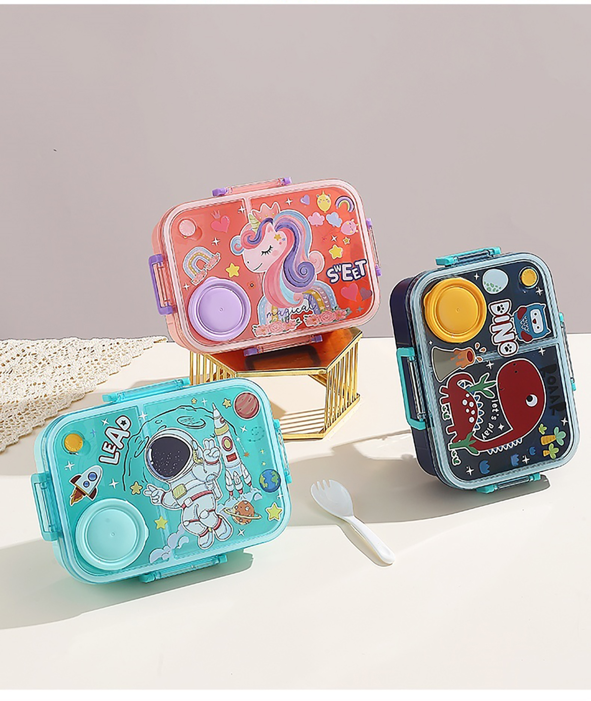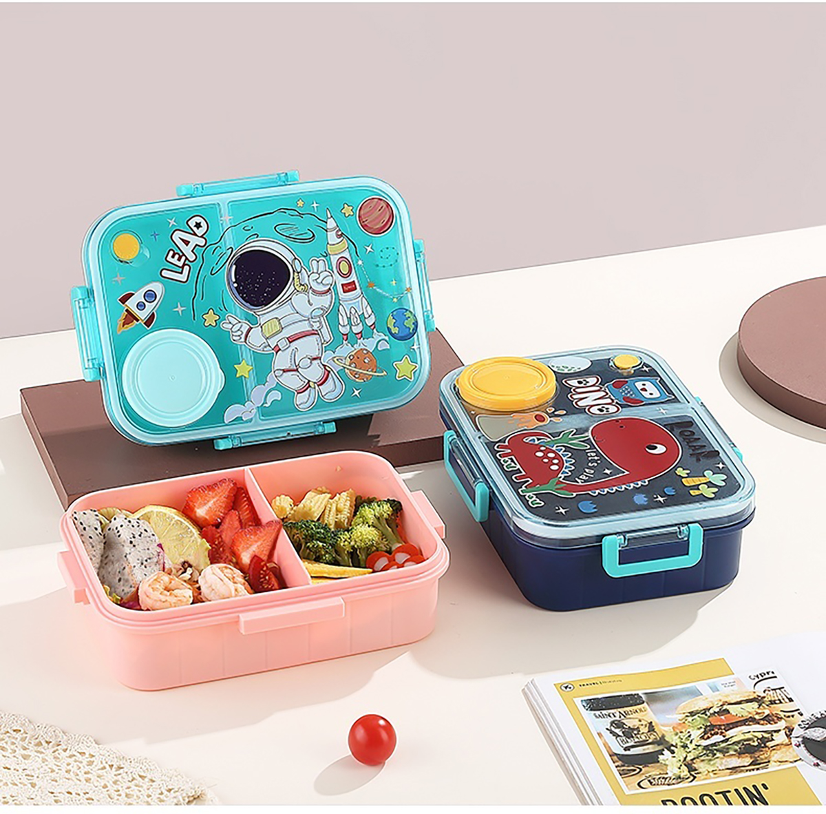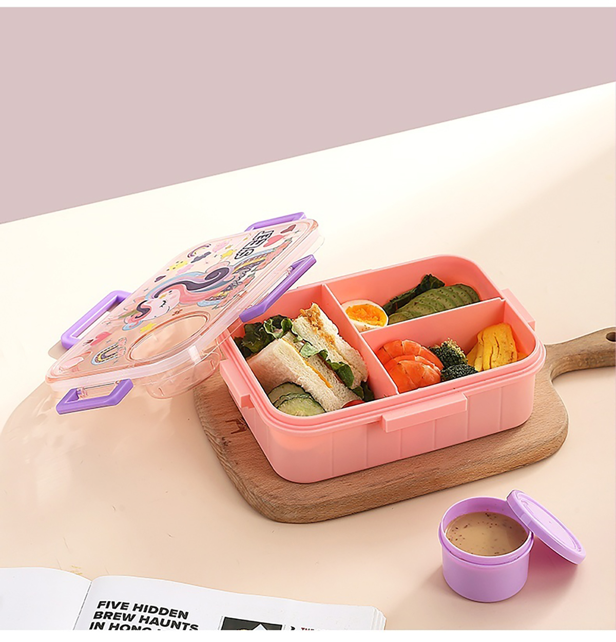 1.2L幻彩卡通獨立密封塑料餐盒(2格/3格+醬杯80ml+PP勺)