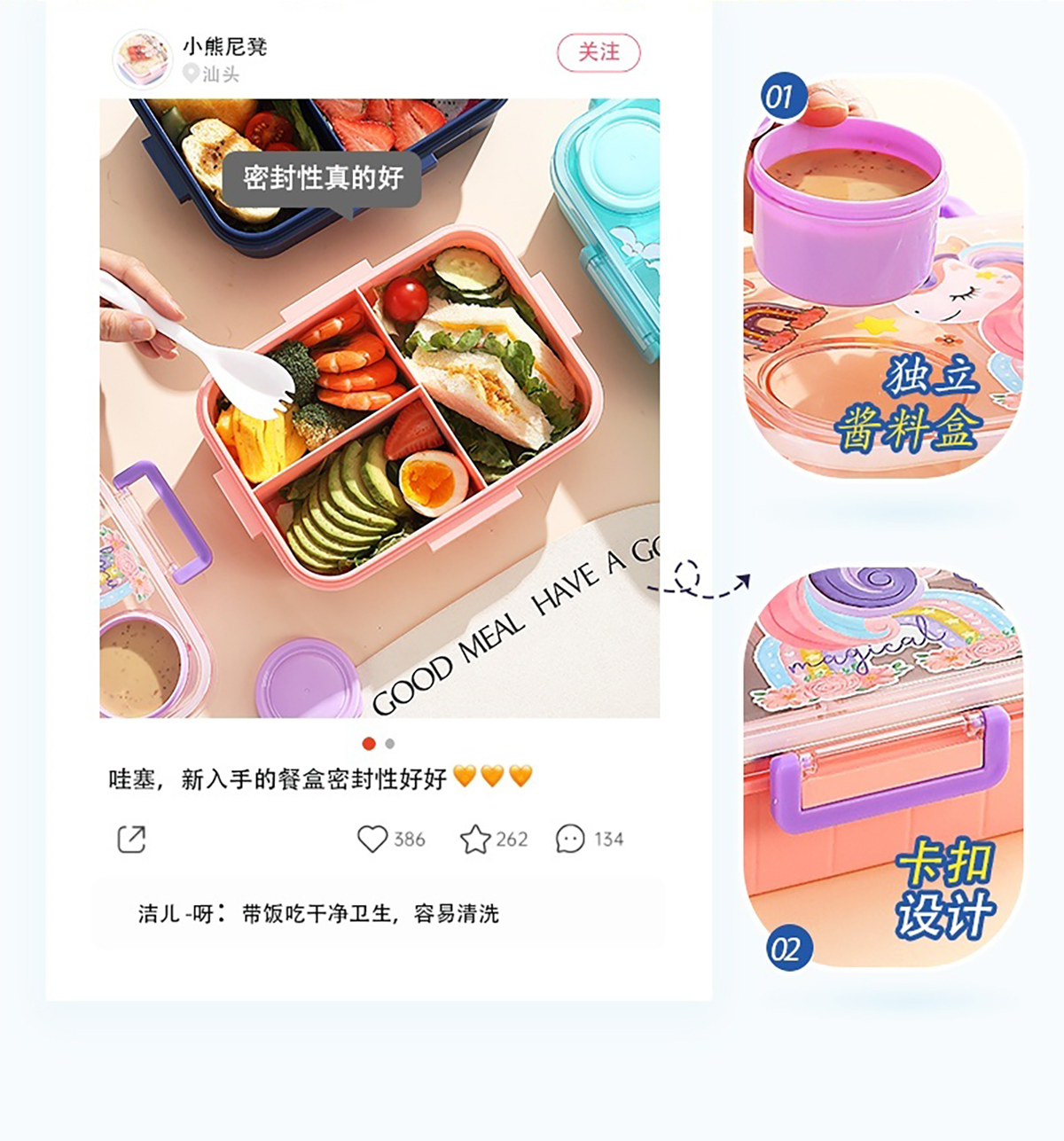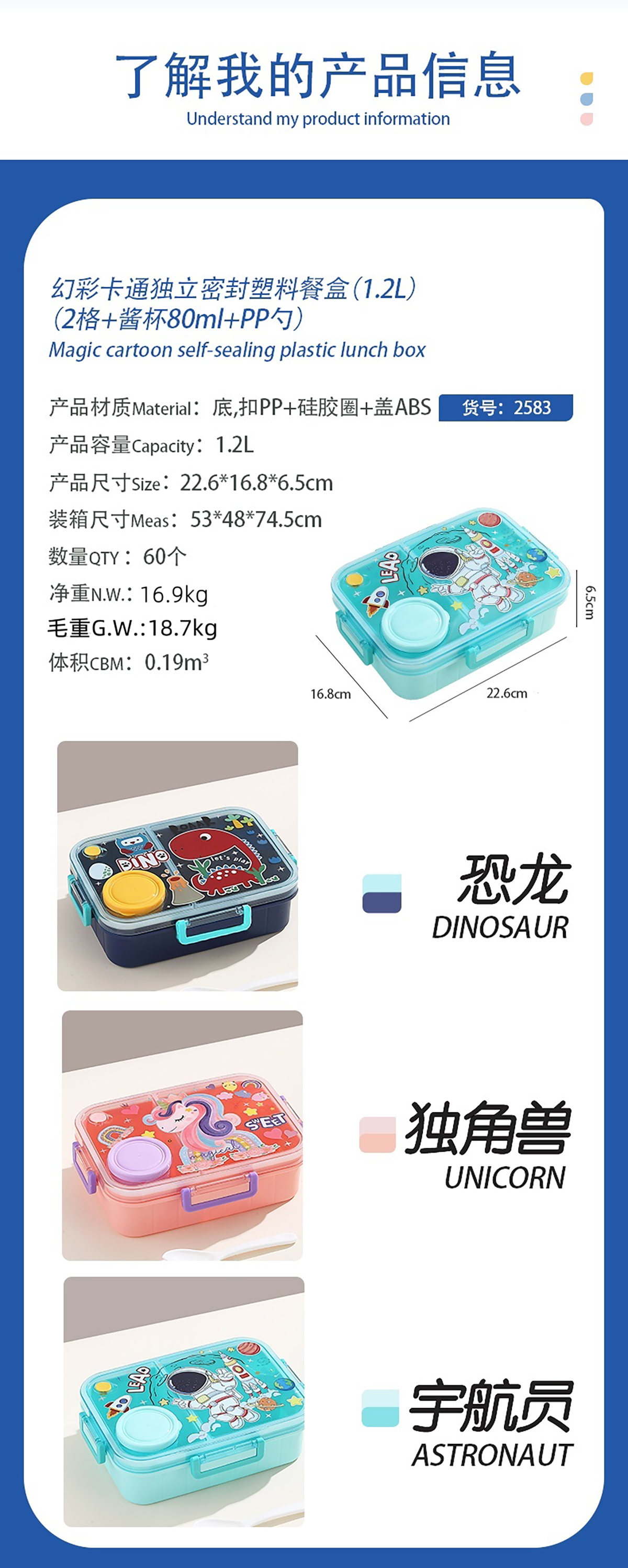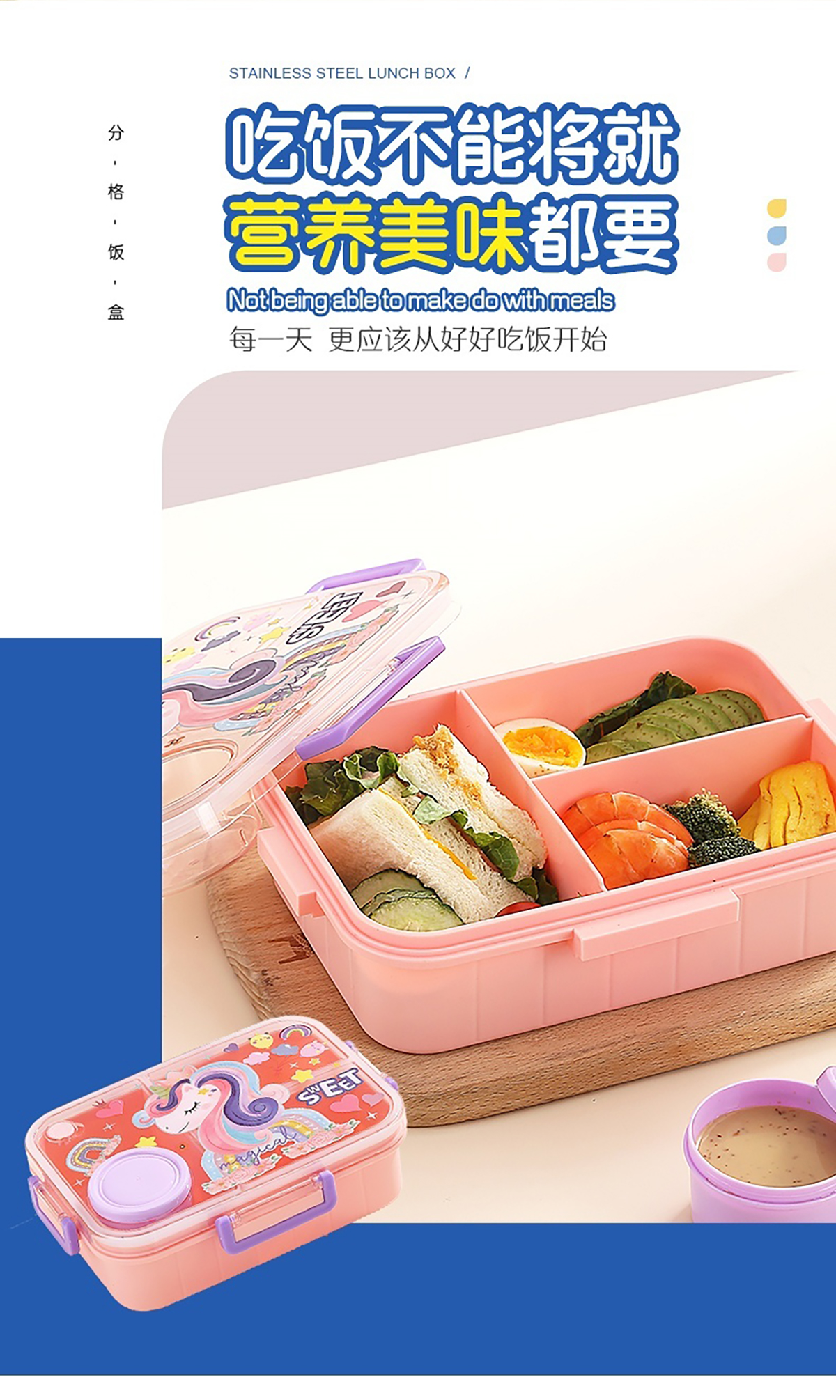 1.2L幻彩卡通獨立密封塑料餐盒(2格/3格+醬杯80ml+PP勺)