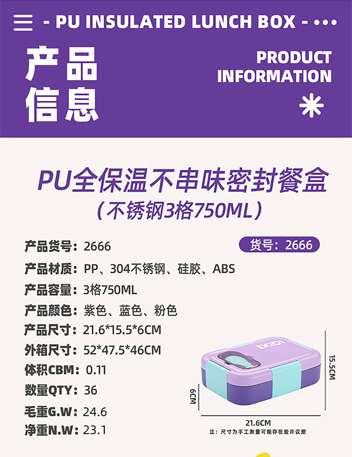 Size: AQX-2666(3格):216*155*60mm/750ml